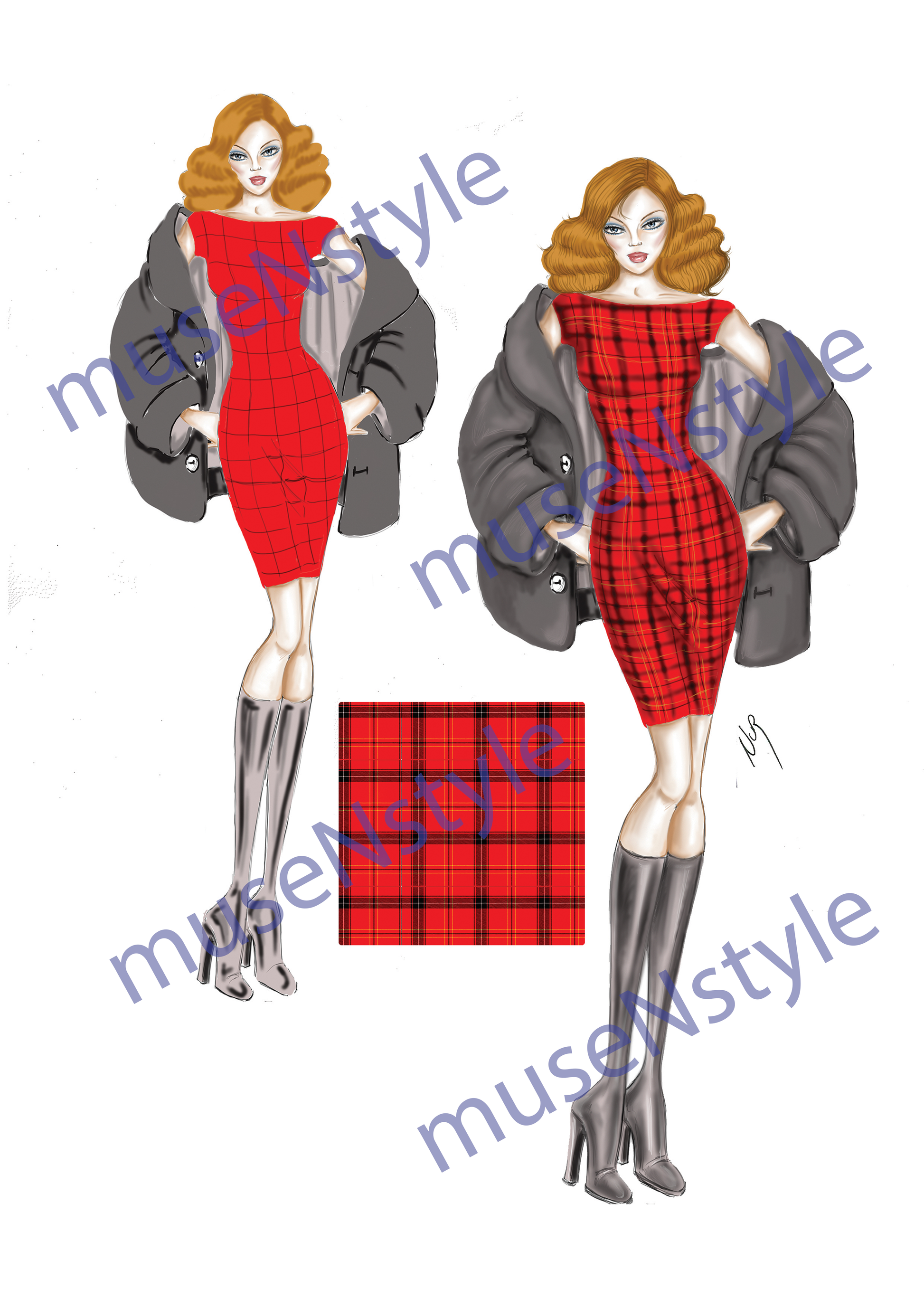 Karşıdan görünen estetik duruşlu, manken üzerinde yünlü ekose kumaş ile bir elbise ve peluş kaban tasarımı.